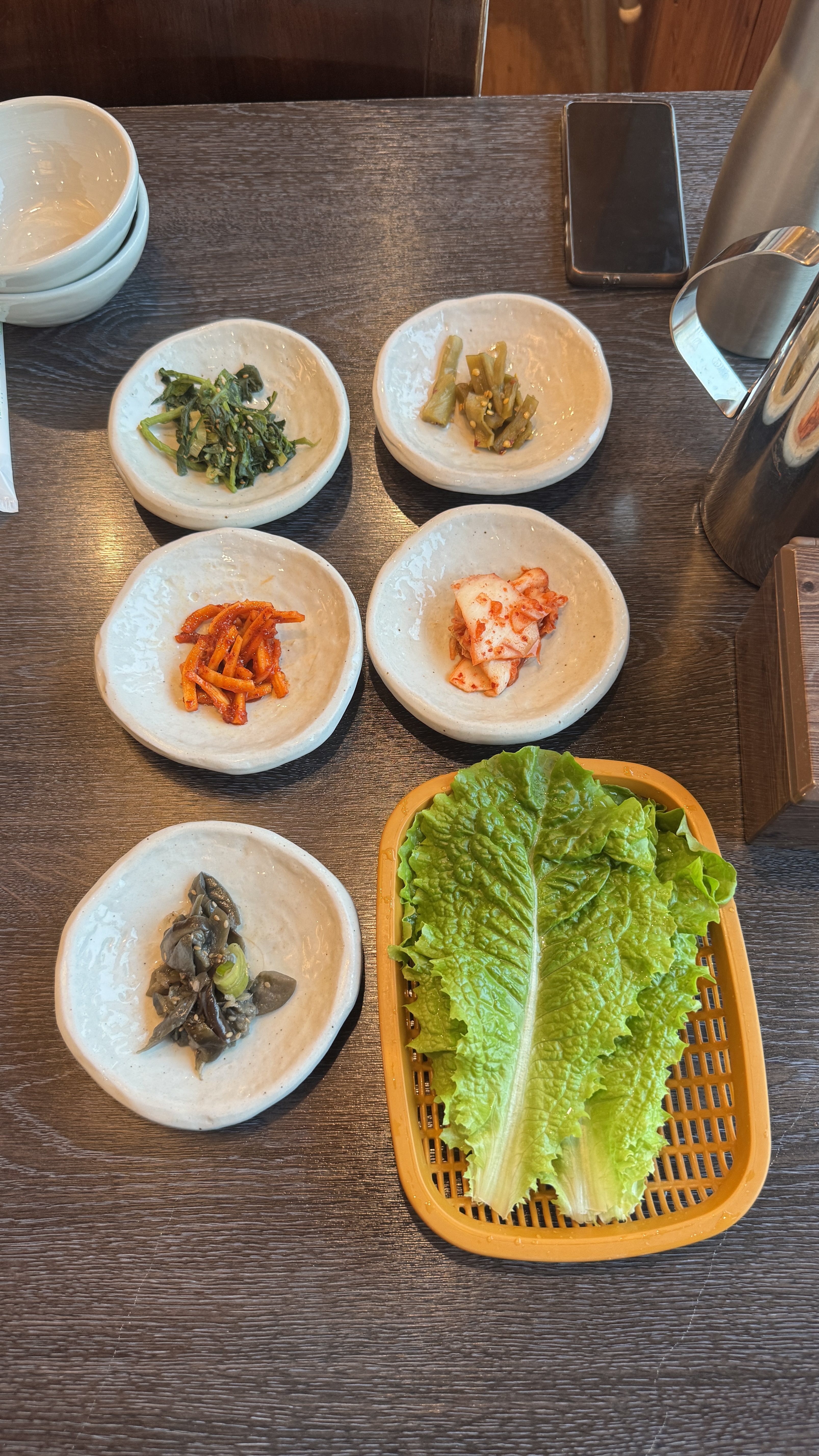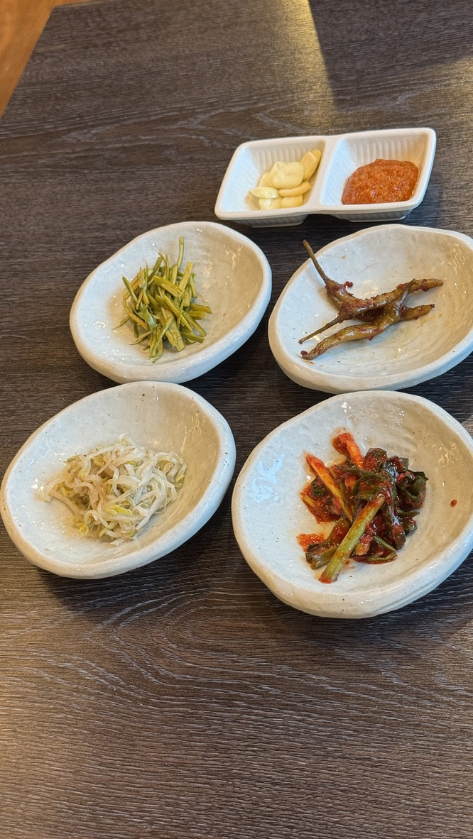 한식집이라 그런지 기본찬이 다양했다. 나오는 양은 많지 않으나 더 달라고 하면 바로 챙겨주시기 때문에 처음부터 과하게 담아서 남기는 것보다 낫다고 생각했다. 우리는 3가지 반찬과 쌈채소를 리필했다.