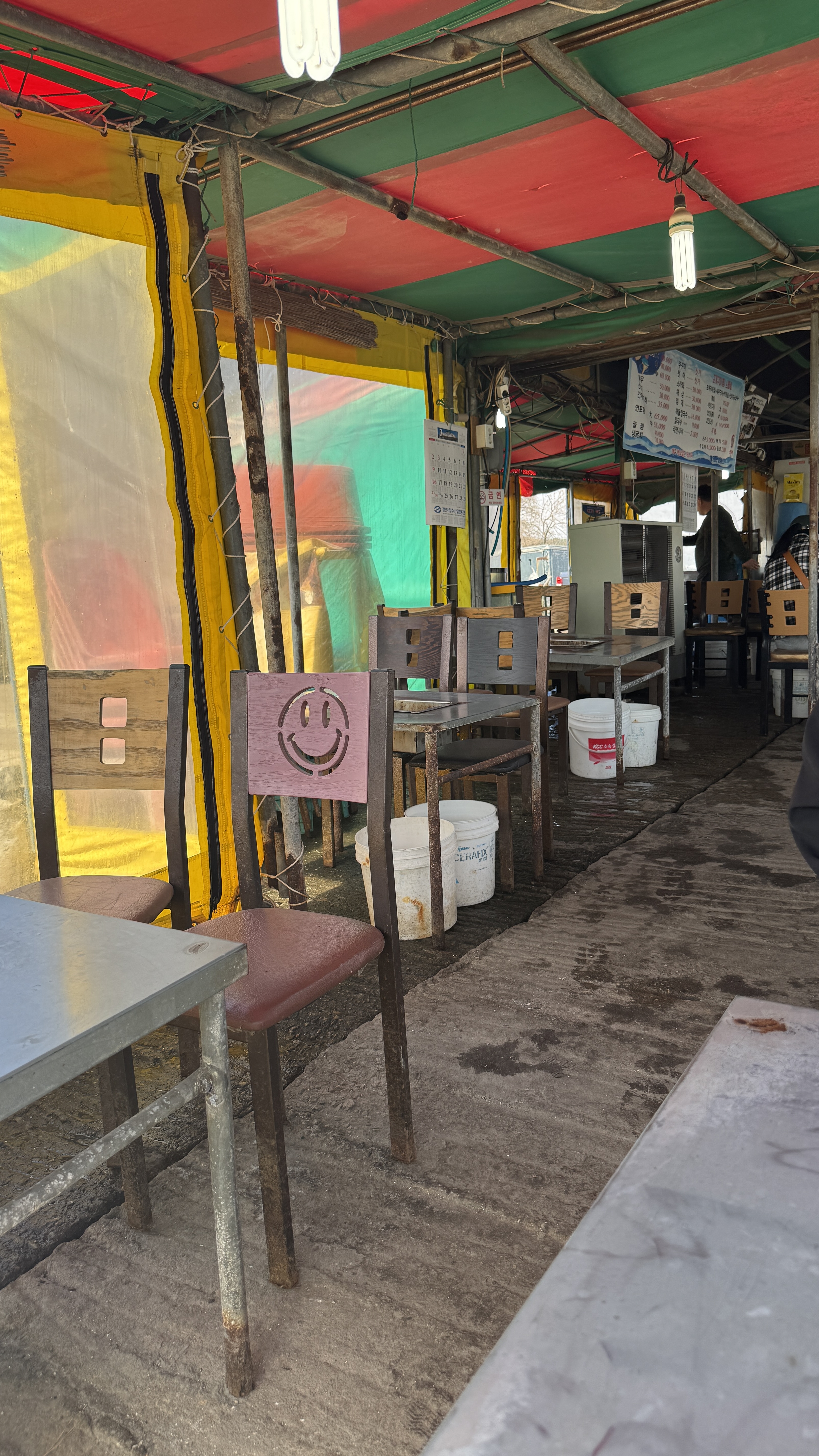 노포 느낌 물씬 나는 동환네 조개구이 내부. 포장마차와 비닐하우스 그 사이 어딘가의 느낌이 난다. 쌓아 올린 건물이 아닌 이런 곳도 네이버지도에 장소 등록이 되어있다는 사실에 새삼 놀라며 안쪽에 자리를 잡았다.