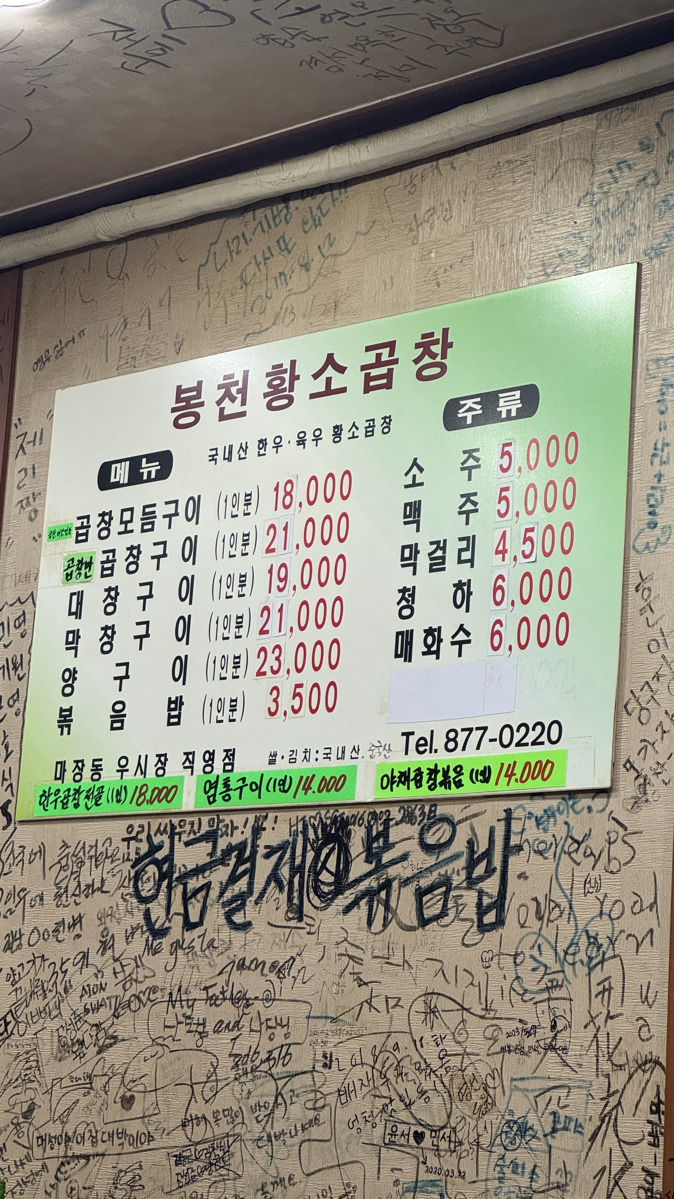 최소 10번은 갔을 테고 몇 번 갔는지는 셀 수 없는 봉천 맛집 봉천황소곱창. 여기에 쓴 돈만 100만원이 넘을 게 틀림없다.