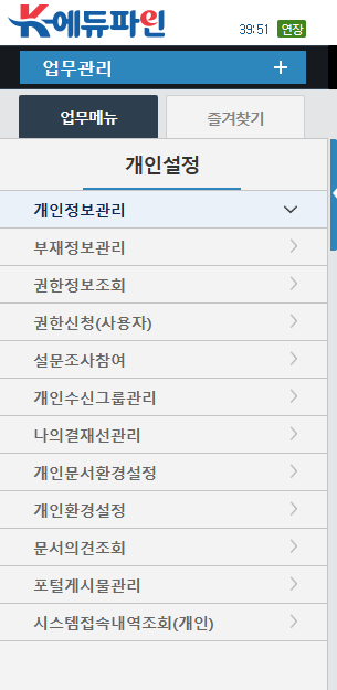 우선 K-에듀파인 좌측 상단에서 [개인설정] 아이콘을 클릭한다.