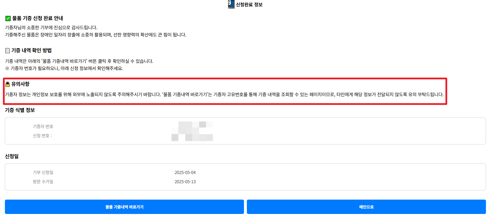 신청을 끝내면 기증 식별 정보도 확인 가능하다. 나중에 이 번호를 이용해 조회할 수 있다.