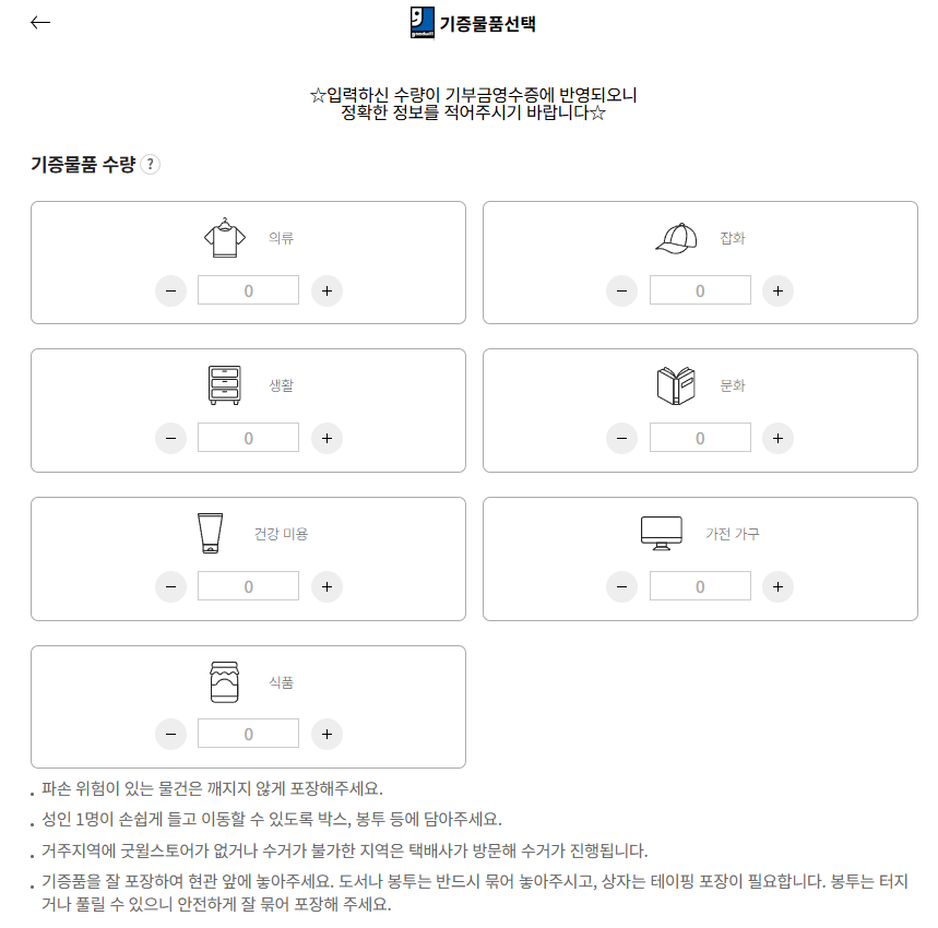 다음 단계는 물품 수량을 입력하는 페이지. 기부금 영수증의 금액과 연결되기 때문에 정확히 입력하는 것이 좋다. 나는 박스포장을 하면서 옷을 세어두었기 때문에 큰 문제 없이 입력했는데, 박스포장을 먼저 다 끝낸 후 물품을 입력하려고 하면 정확한 수량을 알기 어렵다. 포장을 하며 수량을 미리 세어두거나 물품을 입력하면서 포장을 하는 방식을 추천한다.