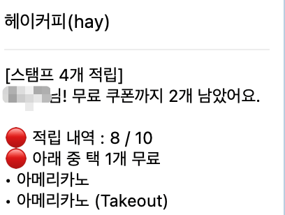 디카페인 옵션이 있어서 소금커피는 디카페인으로 주문했는데 이 옵션 역시 쿠폰 도장 1개로 카운팅 되어서 총 4개가 적립되었다.