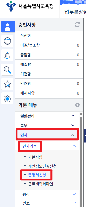 나이스 [기본 메뉴]에서 [인사] - [인사기록] - [증명서신청]으로 들어간다. 하위 메뉴로 여러 번 들어가야 해서 찾기가 어려울 뿐 막상 찾고 나면 아주 쉽다.