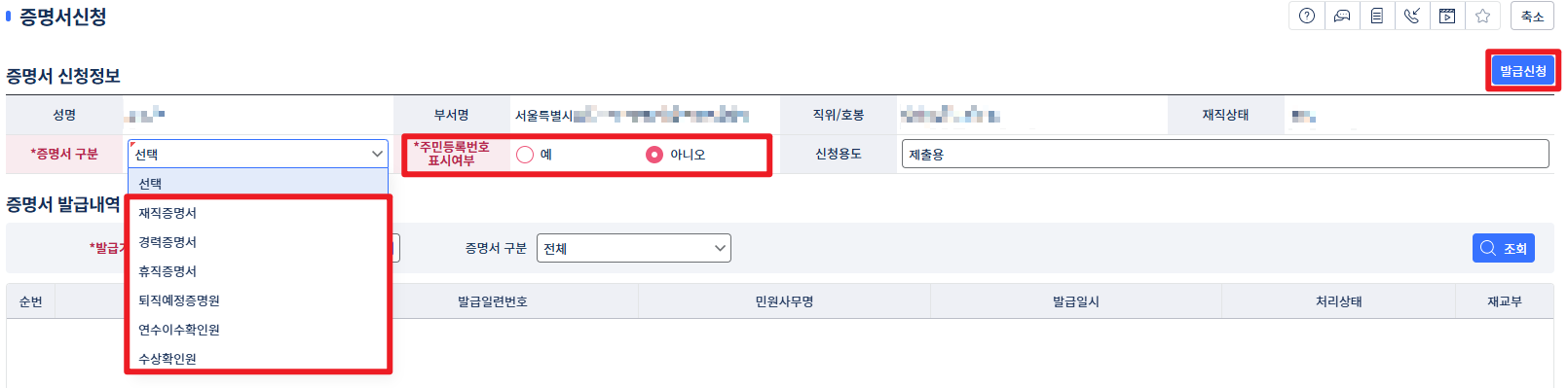 모두 선택했다면 우측 상단의 [발급신청]을 클릭하면 끝.
