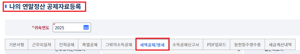 교사의 연말정산은 나이스를 기본으로 한다. 나이스 [기본메뉴]에서 [연말정산] - [나의 연말정산 공제자료] 탭으로 들어간다.