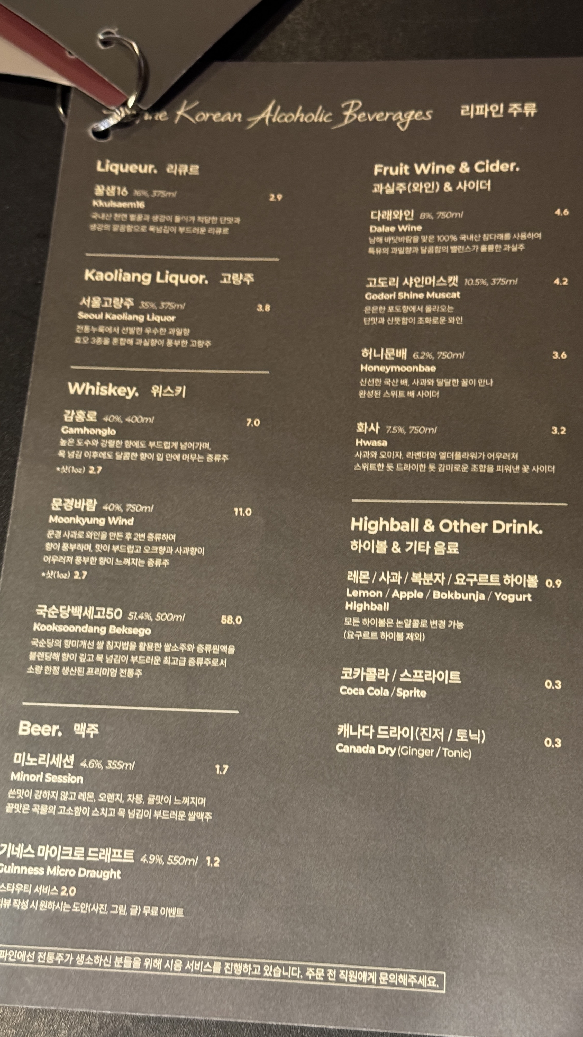 일반 술집에서 판매하는 소주, 맥주는 취급하지 않으니 방문 전 참고하는 게 좋다. 그리고 기본적으로 술집이기 때문에 주류 주문은 필수. 일행 전원이 술을 마시지 못한다면 방문하기 어렵다.