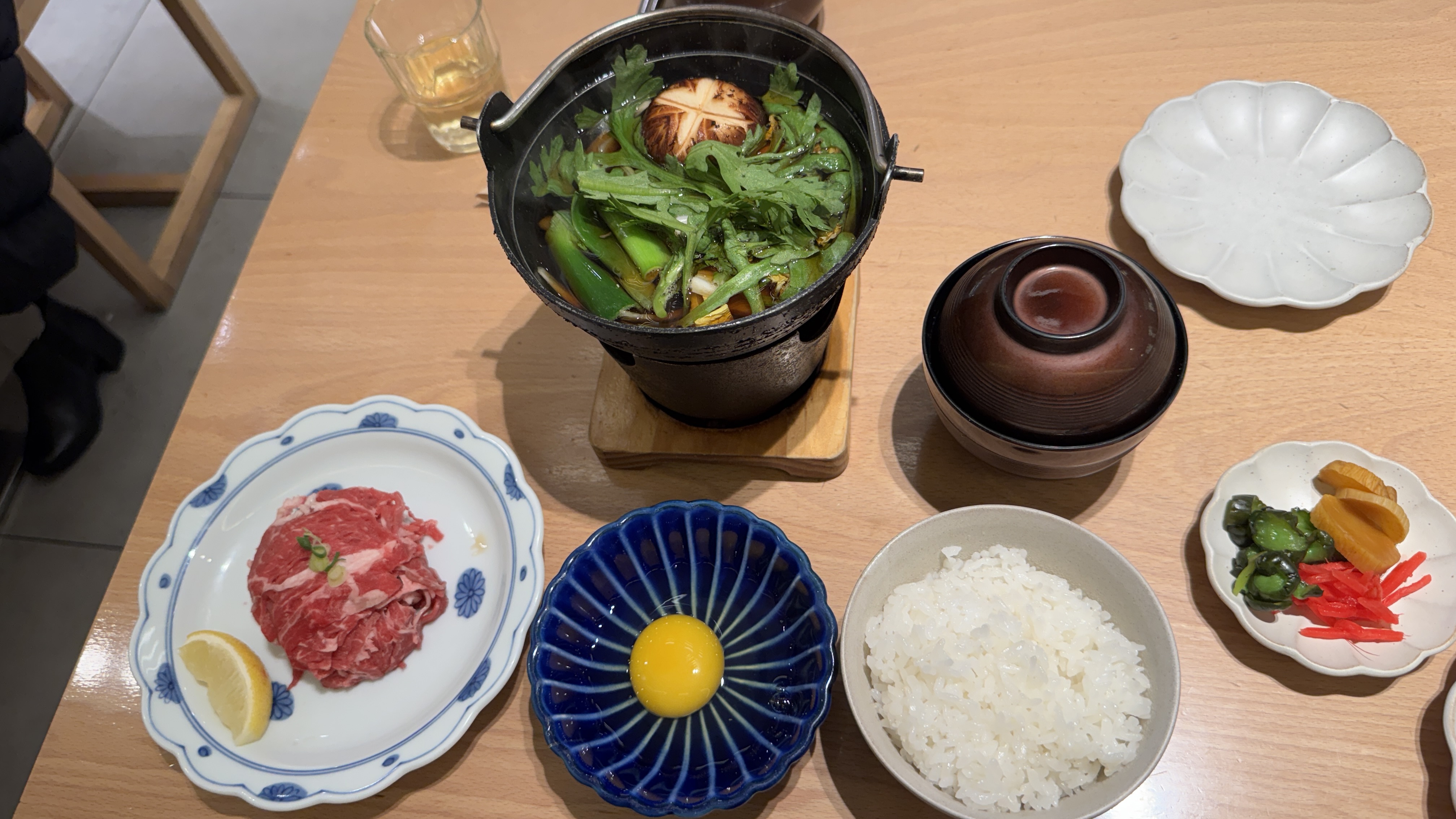소고기는 따로, 야채는 국물에 담긴 채 제공되었고 찍어 먹는 용도의 달걀이 따로 담겨 나왔다. 스키야키 자체가 국물이 있는 메뉴라 국이 안 나오는 경우도 많은데 별도로 된장국이 나오는 점이 좋았다.
