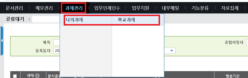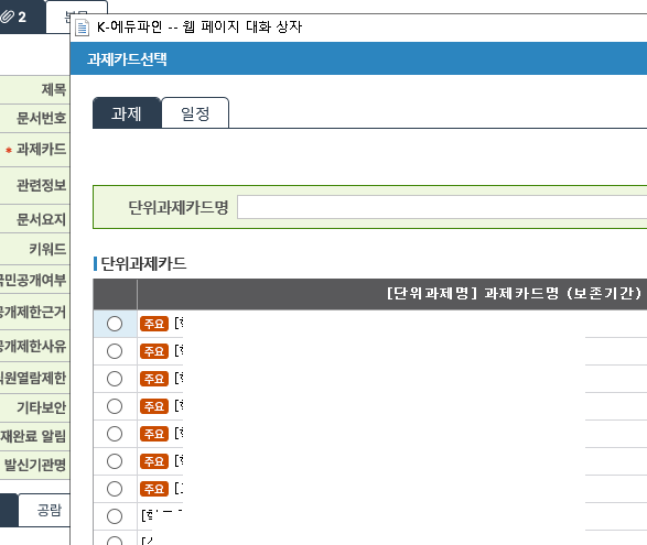 이번엔 [나의과제] 탭이다. 담당자를 통해 부여 받은 과제카드를 모두 조회할 수 있는데, 실제 공문을 처리하는 과정에서 과제카드를 선택할 때도 이와 똑같은 순서로 팝업창이 뜬다.