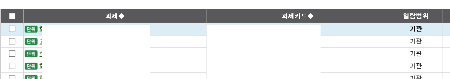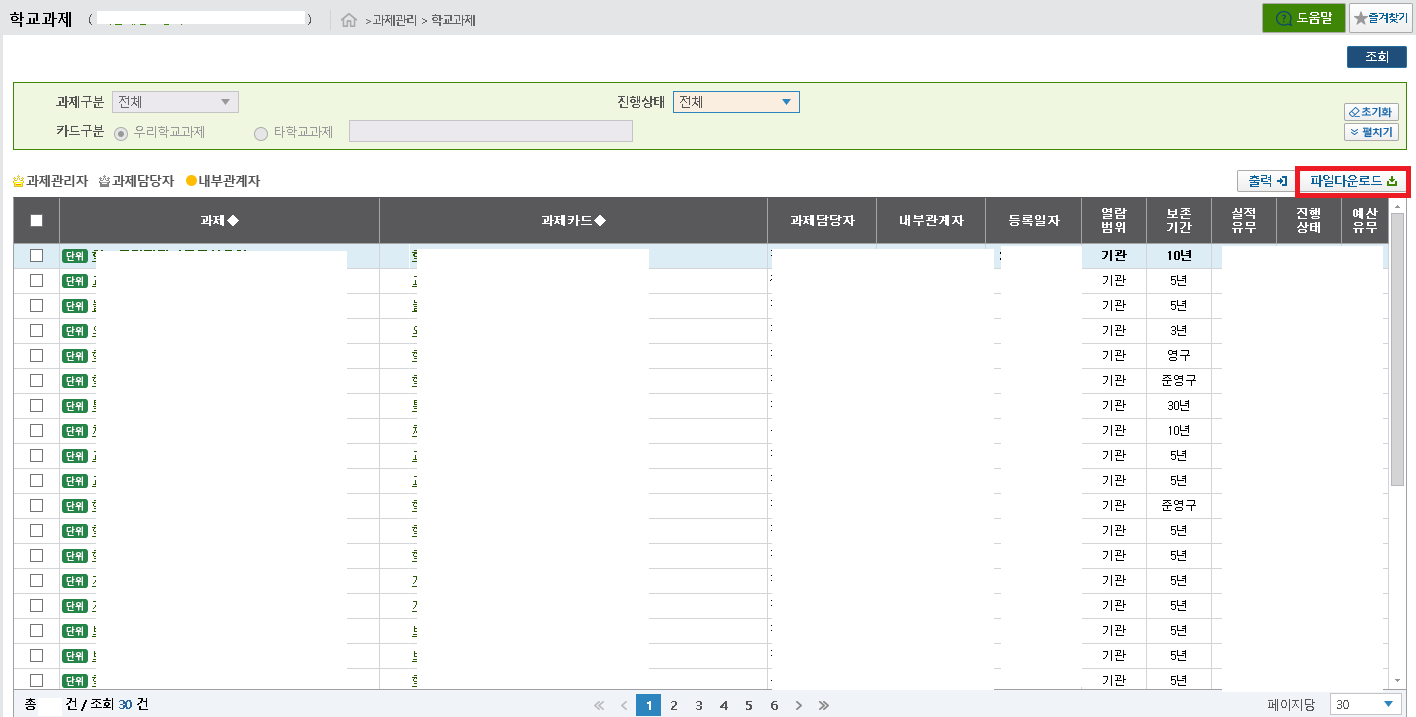 메뉴에 들어가면 사진과 같이 전체 과제 목록이 보인다. 하지만 그 수가 너무 많고 원하는 것을 찾기 어렵게 되어 있다. 이 문제를 좀 더 편하게 해결하기 위해 우측 상단의 [파일다운로드] 기능을 이용하면 좋다. [파일다운로드]를 사용하면 전체 과제카드 목록을 하나의 엑셀 파일로 내려받을 수 있다.