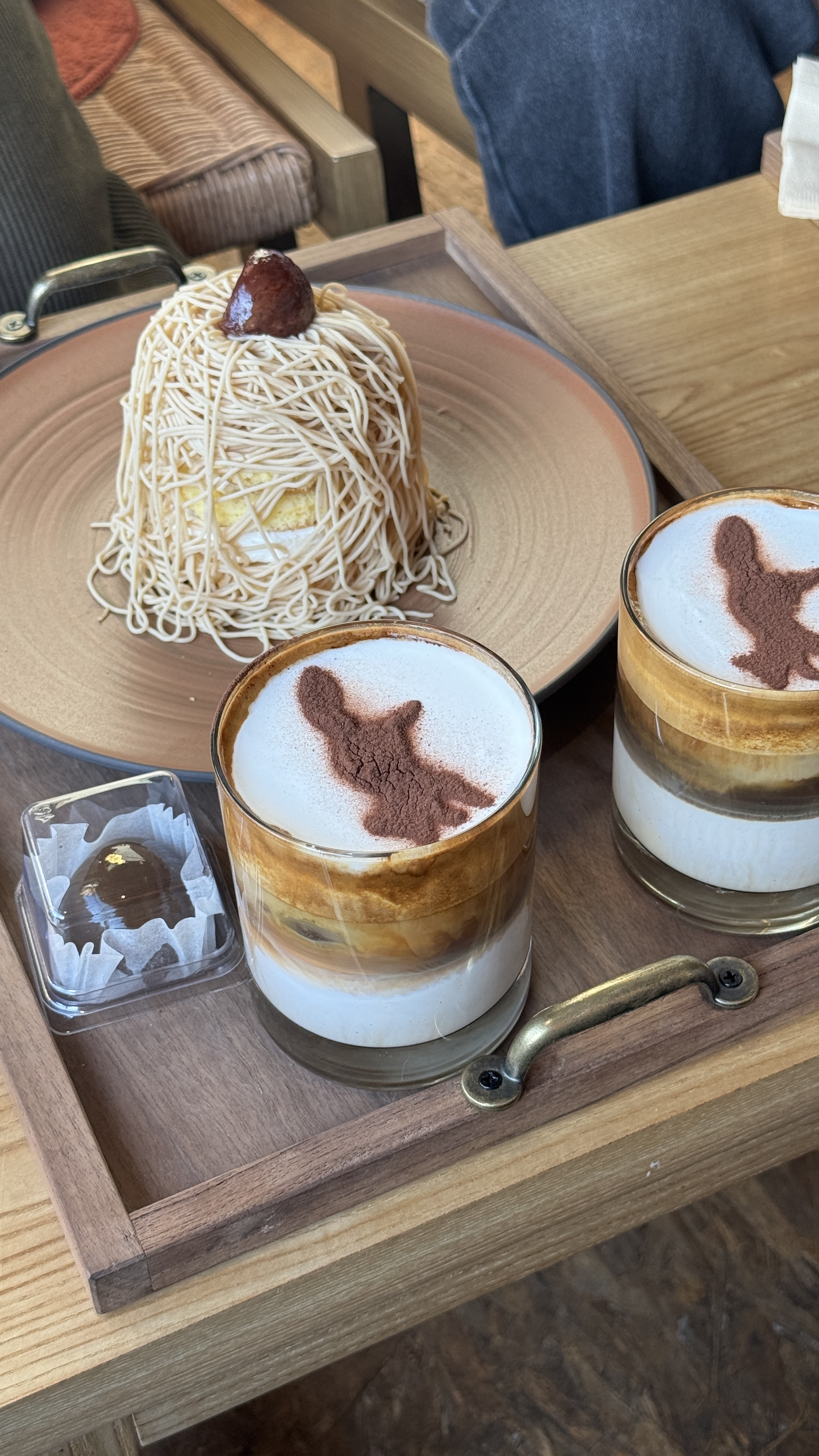 그리고 나온 메뉴들. 만추 몽블랑과 리치아몬드크림라테 2잔.