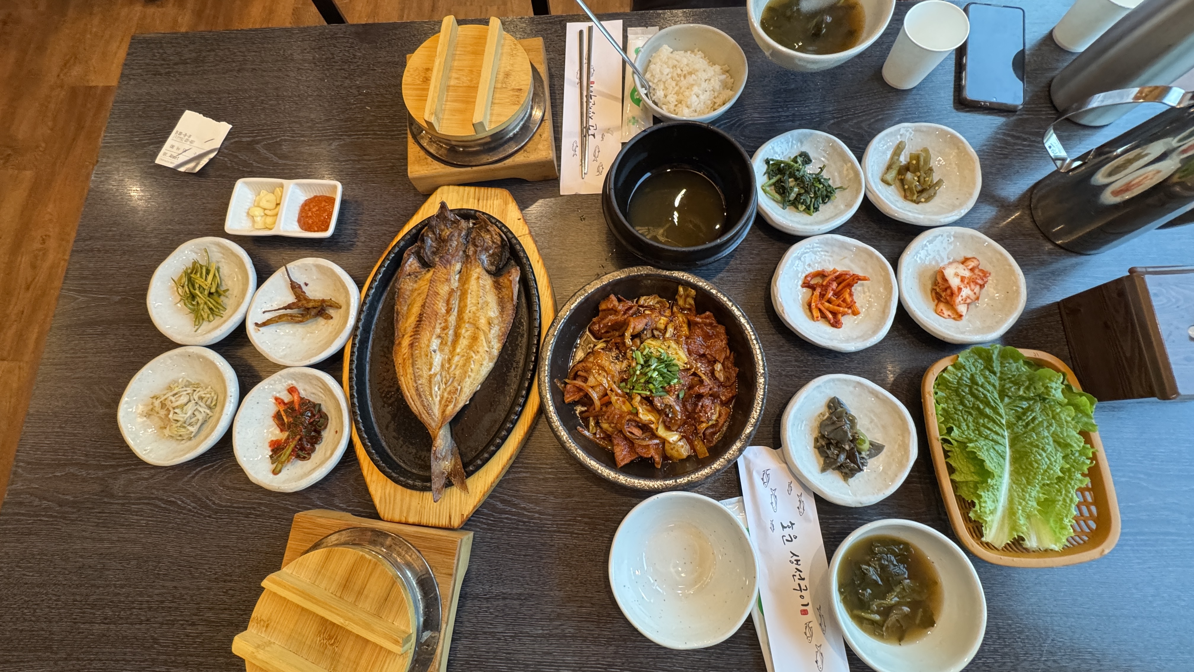 한식집이라 그런지 기본찬이 다양했다. 나오는 양은 많지 않으나 더 달라고 하면 바로 챙겨주시기 때문에 처음부터 과하게 담아서 남기는 것보다 낫다고 생각했다. 우리는 3가지 반찬과 쌈채소를 리필했다.
