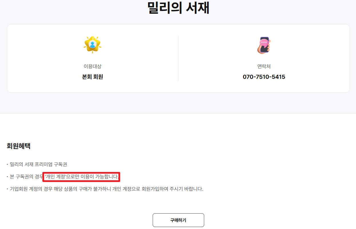 클릭해보면 본회 회원 대상이며 밀리의 서재 개인 계정으로 이용 가능하다는 안내가 나와 있다. 대부분 개인 계정일 테니 이 부분은 큰 문제 없이 진행될 것 같다.