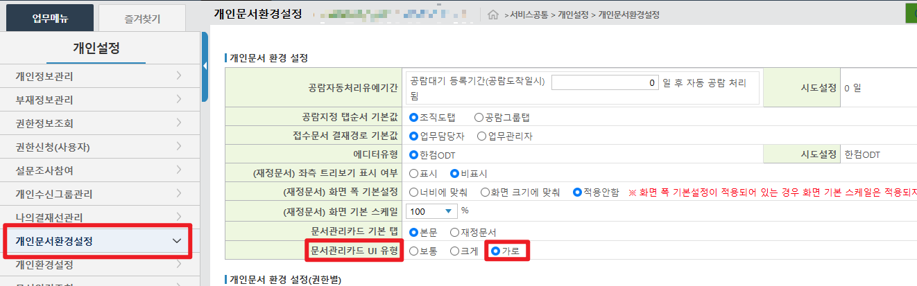 여기서 [문서관리카드 UI 유형]을 [가로]로 선택해주면 된다. 캡처 화면에 보이는 것처럼 그밖의 다양한 기능들도 여기서 변경이 가능하다.