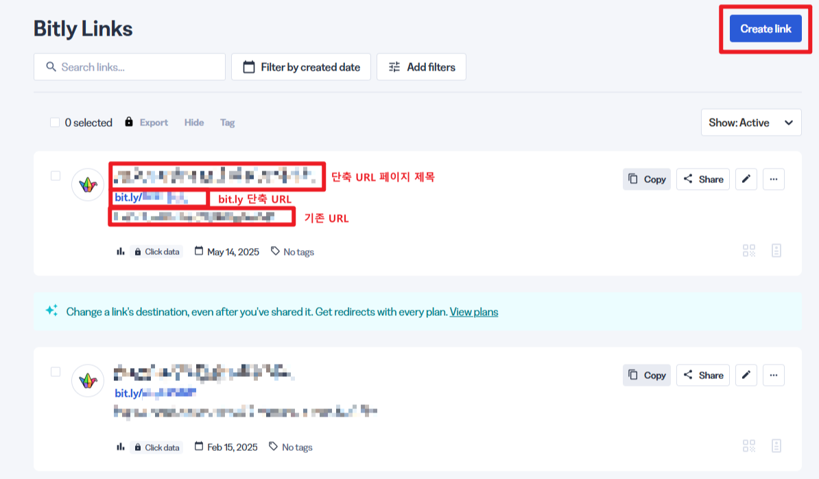 처음 이용하는 경우 목록에 아무 것도 없지만 나처럼 이미 생성한 링크가 있는 경우에는 그 내용도 함께 볼 수 있다. 위 사진에 적어놓은 것처럼 내가 생성한 단축 URL의 페이지명, bit.ly로 시작하는 단축 URL, 그리고 기존 URL이 순서대로 표시된다.