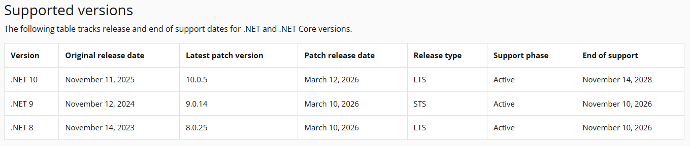 현재 .NET 10은 2028년 11월까지 지원될 예정이다.