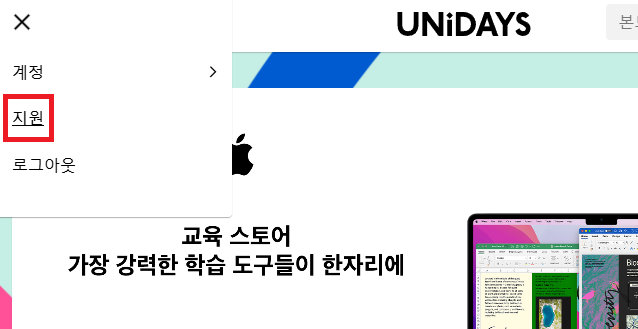 유니데이즈 홈페이지 좌상단 [메뉴] - [지원] 으로 들어간다.