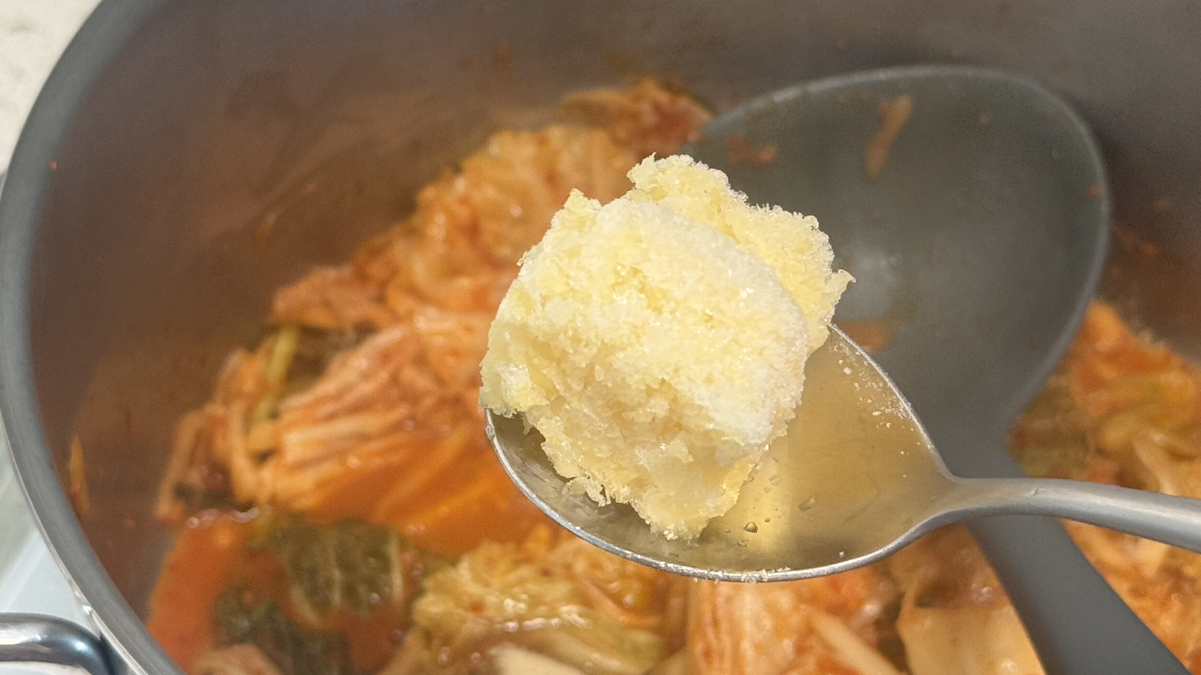 설탕은 최소 1스푼, 신김치의 맛이 너무 강하다면 조금 더 넣어줘도 좋다. 나는 처음에 1스푼 넣고 나중에 국물 맛을 본 후 더 넣어주는 편인데 이번엔 김치의 신맛이 강해서 0.5스푼 추가하여 총 1.5스푼 정도 넣어줬다.