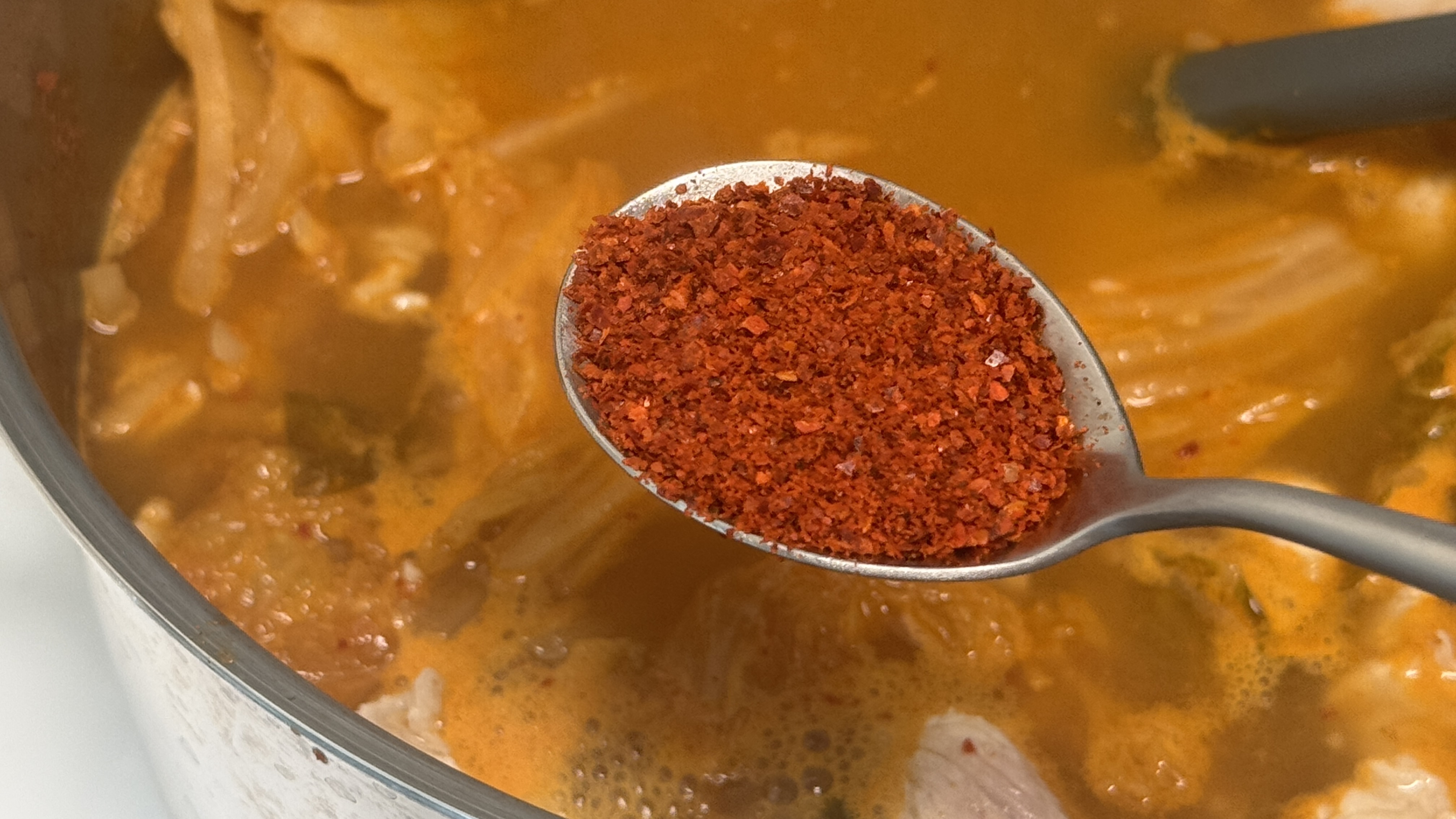 그리고 고춧가루 적당량 추가. 고춧가루는 취향 차이가 크기 때문에 칼칼한 게 좋다면 2스푼 이상, 아니면 1~1.5스푼 정도 넣어주면 된다.